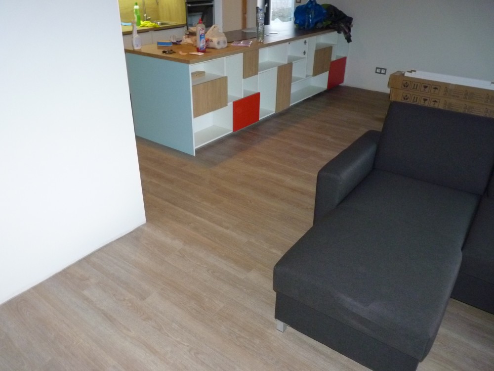 Po vyschnutí byla samonivelační stěrka přebroušena a vysáta od prachu. Následně bylo provedeno celoplošné lepení vinylové podlahy Moduleo Select, kterou se následně obkládaly i schody.